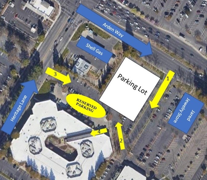 If you are traveling along Arden Way, you will pass through the intersection of Heritage Lane and Arden Way (Shell Gas will be on corner). After you pass the Shell Gas, take the first right (you will see an address sign that reads “1610”) as indicated by the YELLOW Arrow (labeled Number 1).